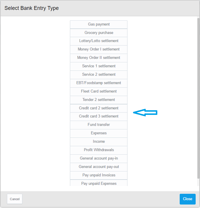 - Credit Card Settlements- When you add a new bank entry type (Bank> Bank Entries> +), you can choose two additional bank entry types: "Credit Card 2 settlement" and "Credit Card 3 settlement":